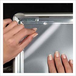 Защелкивающиеся клик-рамки для постеров из алюминиевого профиляЗадача по размещению рекламных постеров легко решается с помощью защелкивающихся рамок из клик профиля. Рамки для постеров должны соответствовать простым требованиям: лёгкость, дешевизна, быстрота сборки, устойчивость к солнечным лучам и воздействию влаги. Всё это в полной мере относится к рамкам из клик профиля. Они производятся из алюминия с анодированным покрытием, материала столь же легкого, сколь прочного и удобного в эксплуатации. Благодаря анодирующему покрытию, клик-рамки для постеров всегда выглядят идеально. Дополнительно, алюминиевые рамки комплектуются специальным вкладышем – его матовый оттенок сводит риск появления бликов к нулю.