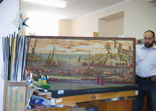 Большие форматы гобеленов нас не пугают. Наша багетная мастерская проводила работы по натяжке и подвесу гобеленов размером до 3 х 6 м.